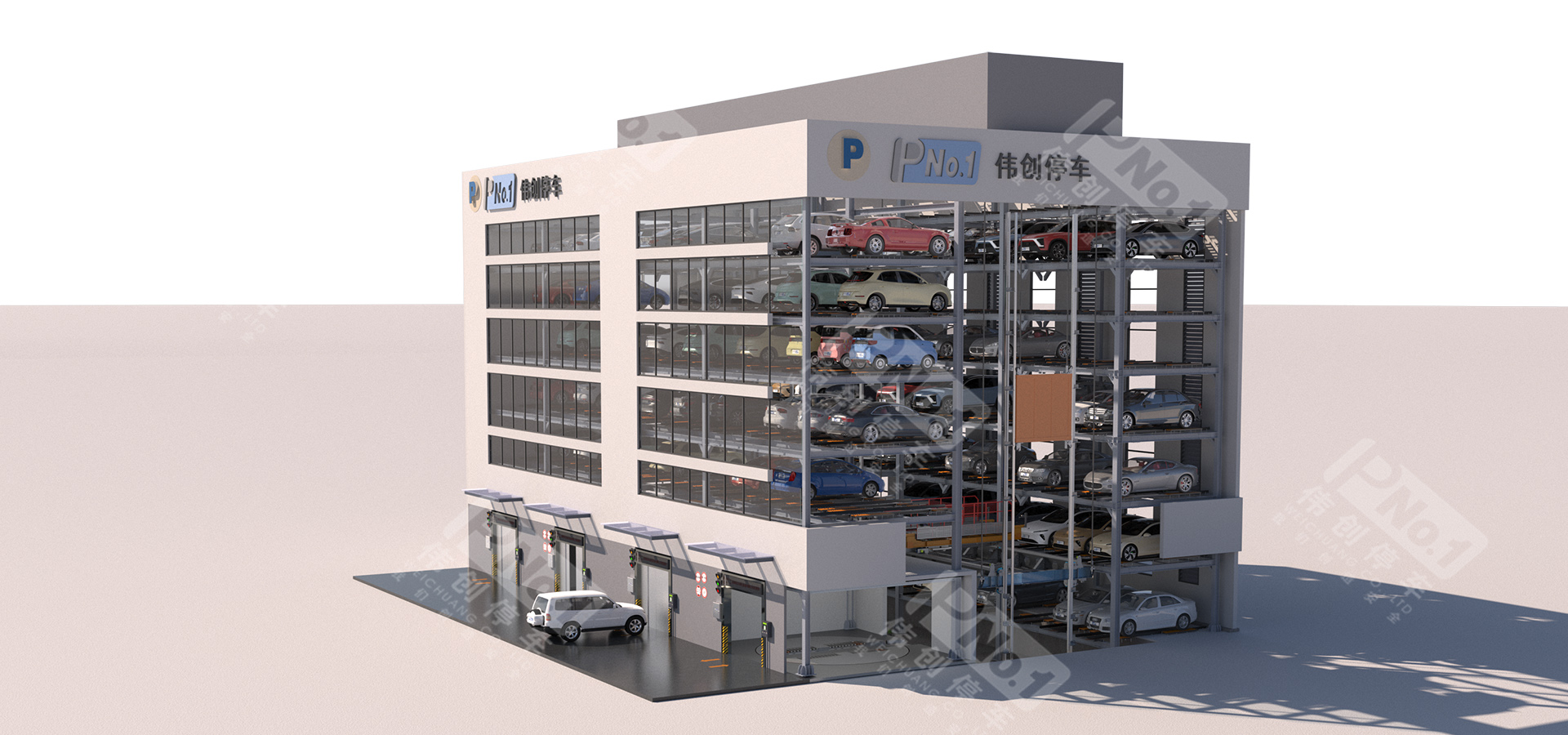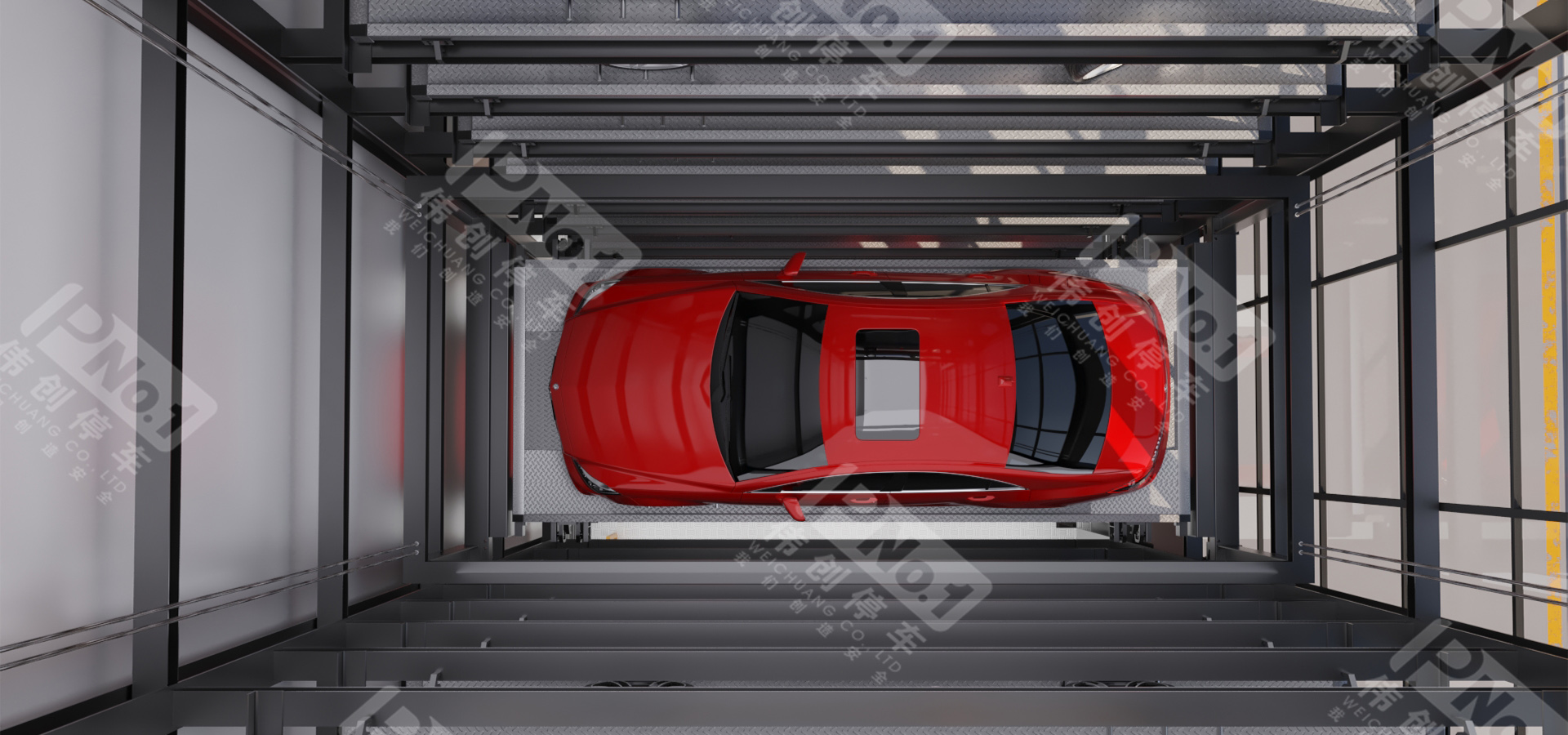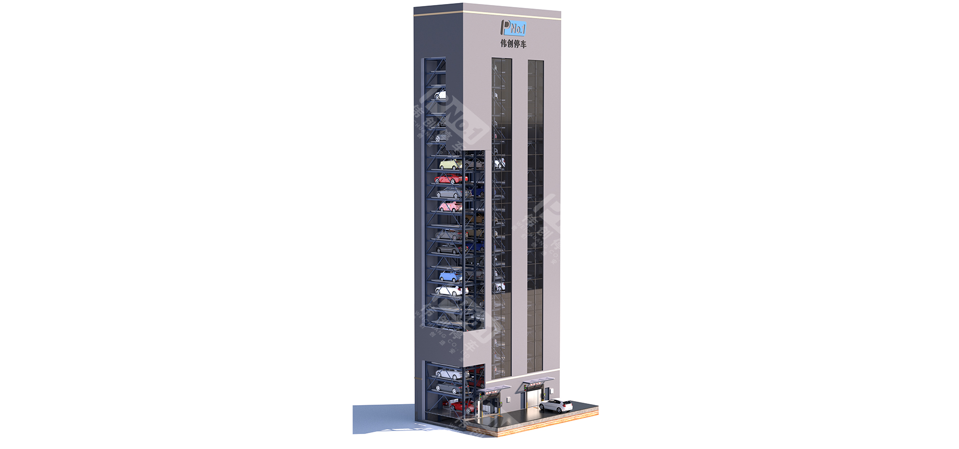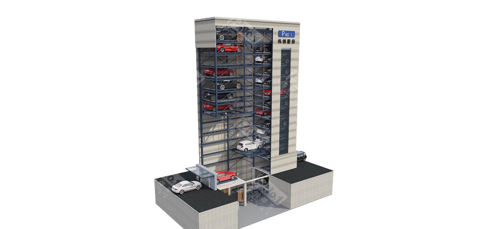 垂直升降亦稱之為塔庫(kù),主要由鋼結(jié)構(gòu)、出入口系統(tǒng)、升降系統(tǒng)、搬運(yùn)器、控制系統(tǒng)、監(jiān)控系統(tǒng)、安全防護(hù)系統(tǒng)組成。升降機(jī)將汽車升降至指定層后,用安裝在升降機(jī)上的存取機(jī)構(gòu)將汽車或載車板送入停車位;反之,用存取機(jī)構(gòu)將停車位上汽車或載車板送入升降機(jī),升降至出入口,打開(kāi)庫(kù)門完成取車。偉創(chuàng)垂直升降式立體停車設(shè)備類似一梯兩戶的獨(dú)立高塔,采用中間搬運(yùn)機(jī)構(gòu)進(jìn)行提升與抓取動(dòng)作,完成在多層結(jié)構(gòu)中存取車過(guò)程。