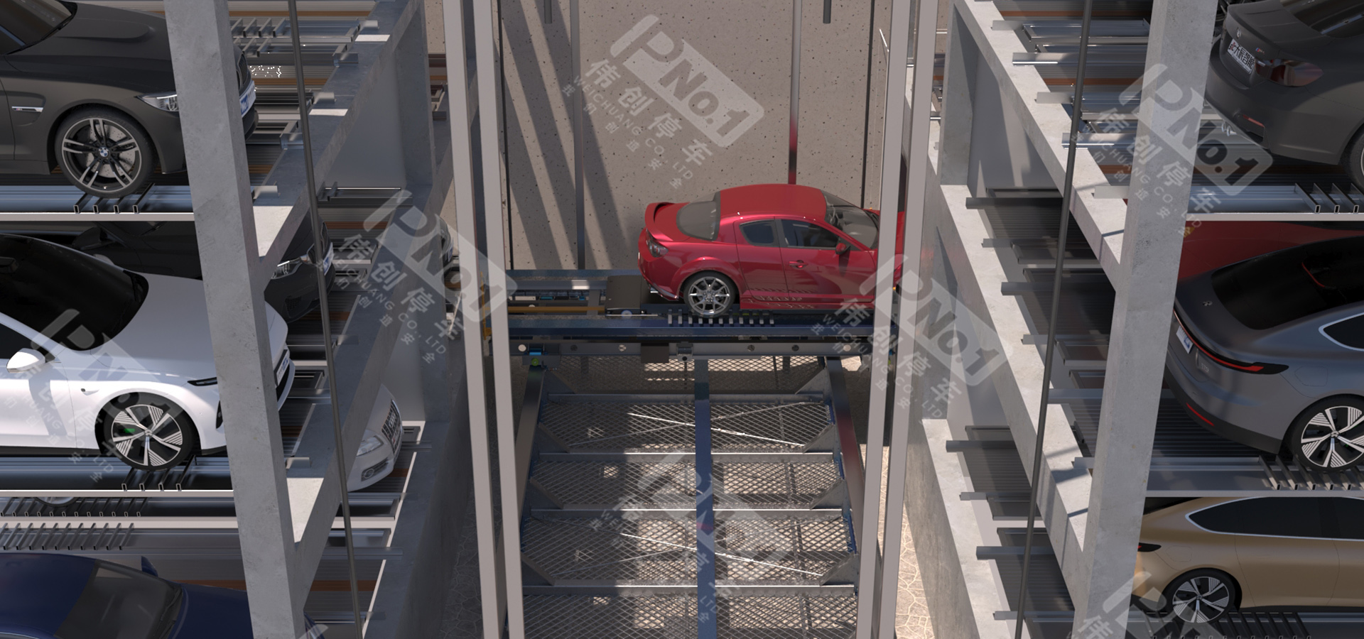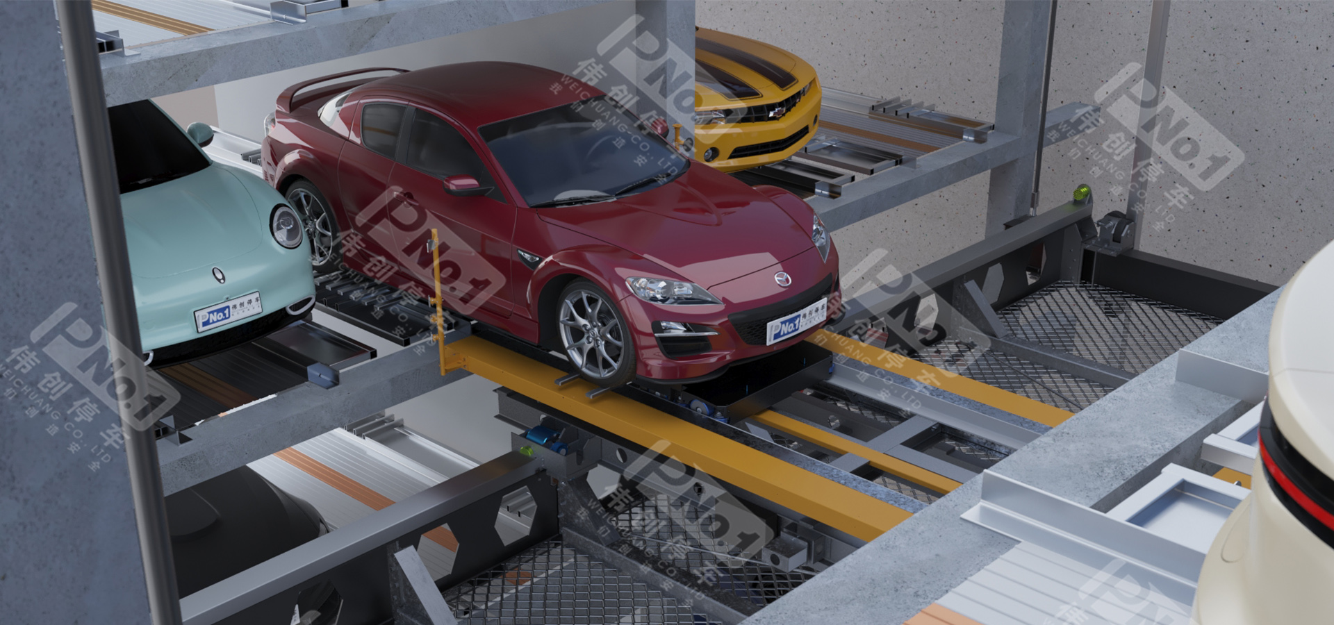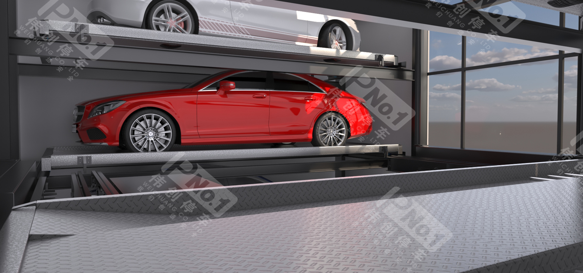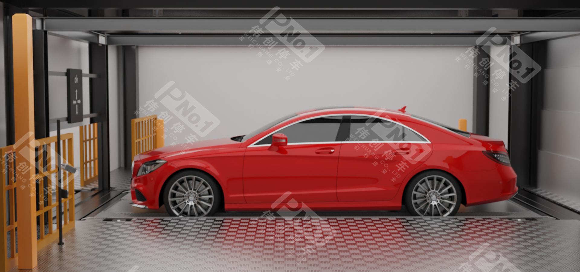 垂直升降亦稱之為塔庫(kù),主要由鋼結(jié)構(gòu)、出入口系統(tǒng)、升降系統(tǒng)、搬運(yùn)器、控制系統(tǒng)、監(jiān)控系統(tǒng)、安全防護(hù)系統(tǒng)組成。升降機(jī)將汽車升降至指定層后,用安裝在升降機(jī)上的存取機(jī)構(gòu)將汽車或載車板送入停車位;反之,用存取機(jī)構(gòu)將停車位上汽車或載車板送入升降機(jī),升降至出入口,打開(kāi)庫(kù)門完成取車。偉創(chuàng)垂直升降式立體停車設(shè)備類似一梯兩戶的獨(dú)立高塔,采用中間搬運(yùn)機(jī)構(gòu)進(jìn)行提升與抓取動(dòng)作,完成在多層結(jié)構(gòu)中存取車過(guò)程。